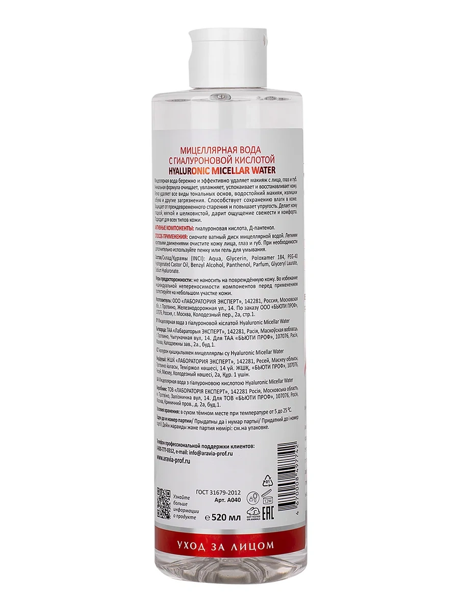 Вода мицеллярная Aravia Laboratories с гиалуроновой кислотой, 520мл