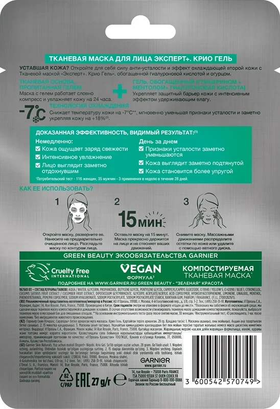 Маска для лица тканевая Garnier Эксперт + Крио-гель, 27г