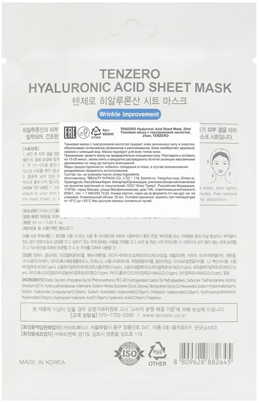 Маска для лица Tenzero тканевая с гиалуроновой кислотой, 25мл
