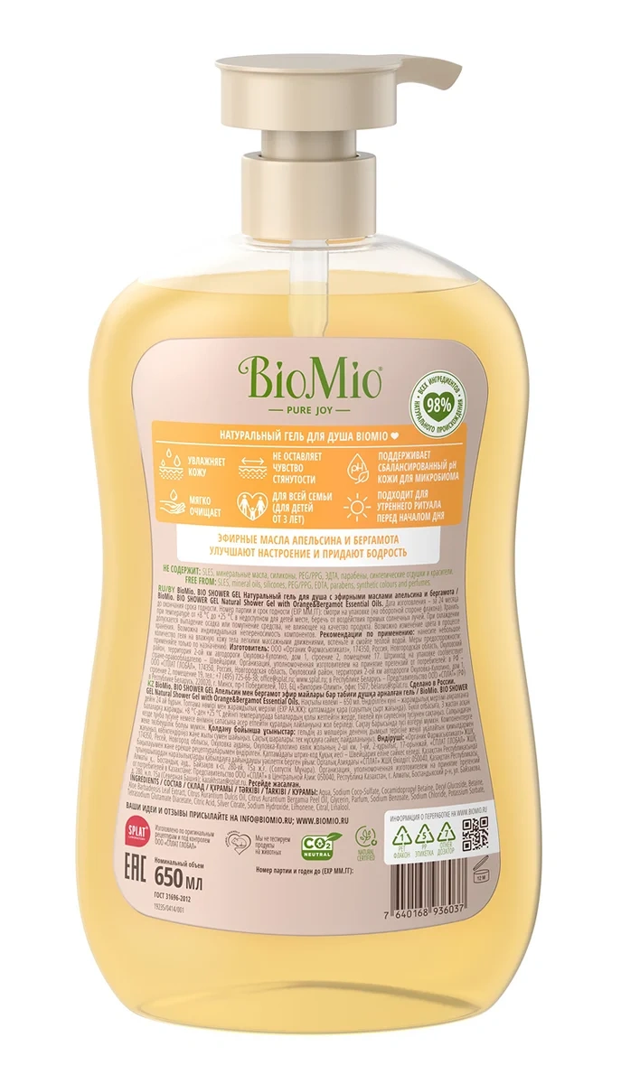 Гель для душа BioMio с эфирными маслами апельсина и бергамота, 650мл