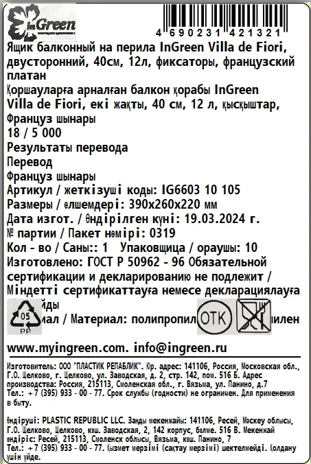 Ящик балконный Ingreen Villa de fiori Французский платан двусторонний, 12л