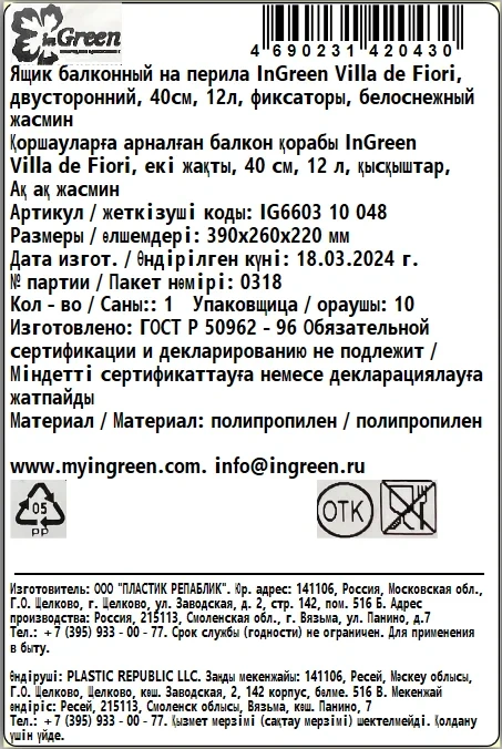 Ящик балконный Ingreen Villa de fiori Белоснежный жасмин двусторонний, 12л