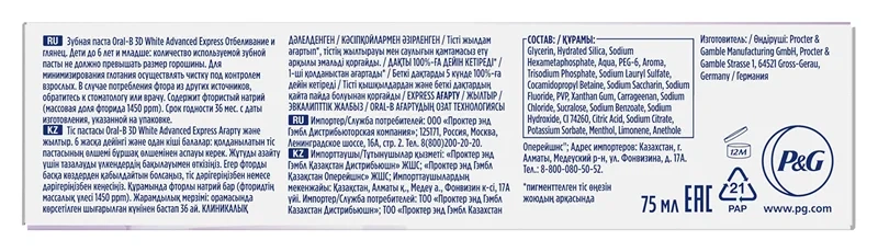 Зубная паста Oral-B 3D White Advanced Express отбеливание, 75мл