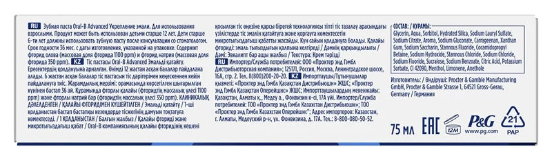 Зубная паста Oral-B Advanced укрепление эмали, 75мл