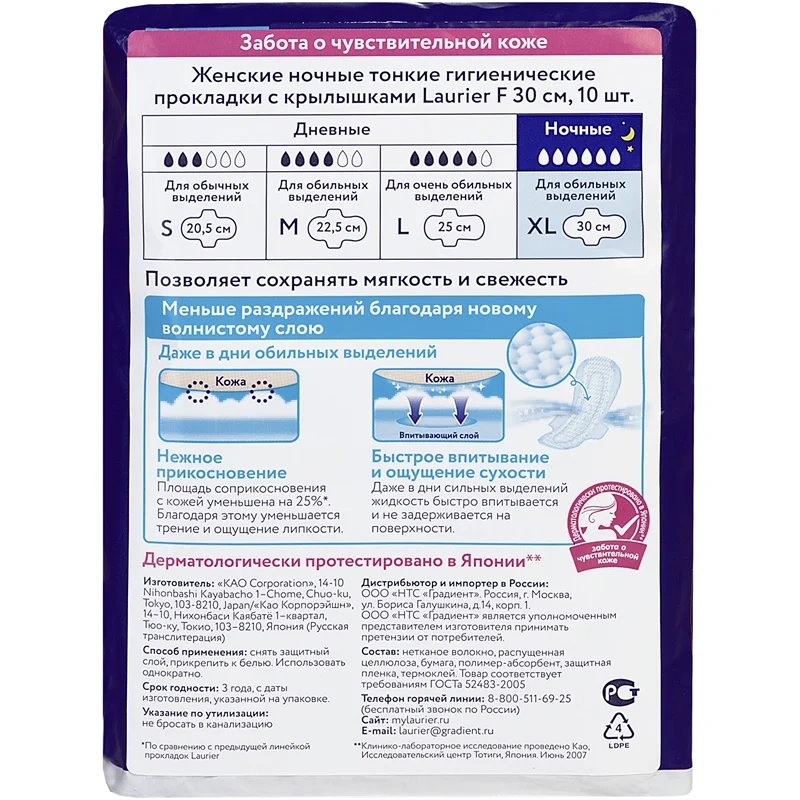 Прокладки гигиенические Laurier F ночные с крылышками 30 см, 10шт