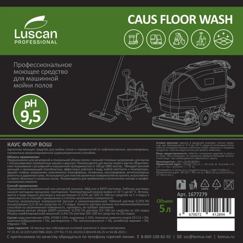 Моющее средство для полов Luscan Professional Caus Floor Wash 5л, с сильной степенью загрязнения