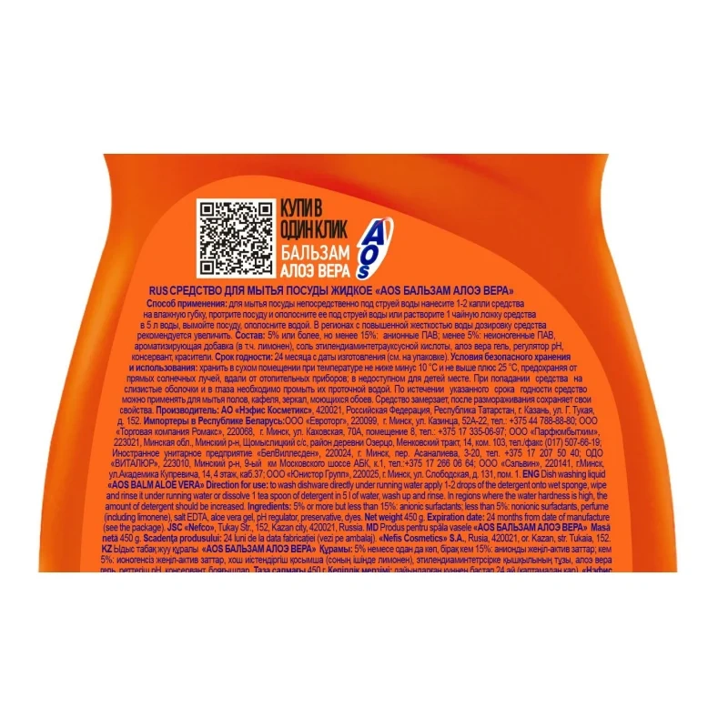 Средство для мытья посуды Aos 450мл, алое вера, бальзам