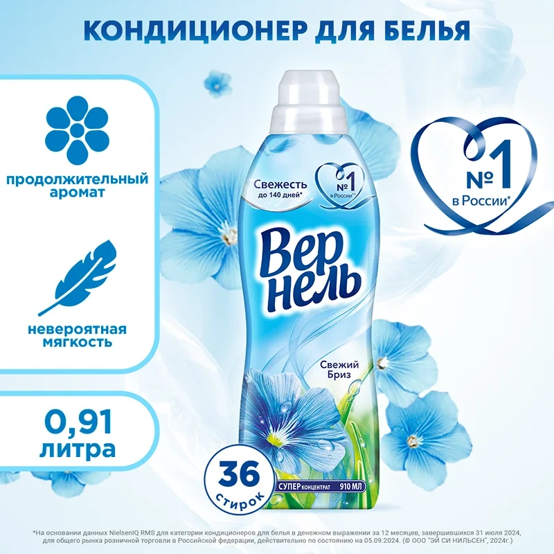 Кондиционер для белья Вернель 910мл, свежий бриз, суперконцентрат