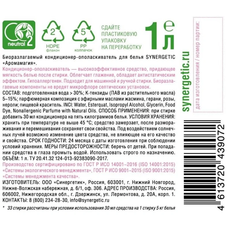 Кондиционер для белья Synergetic Аромагия, 1л, биоразлагаемый