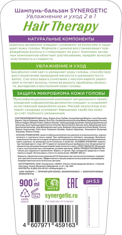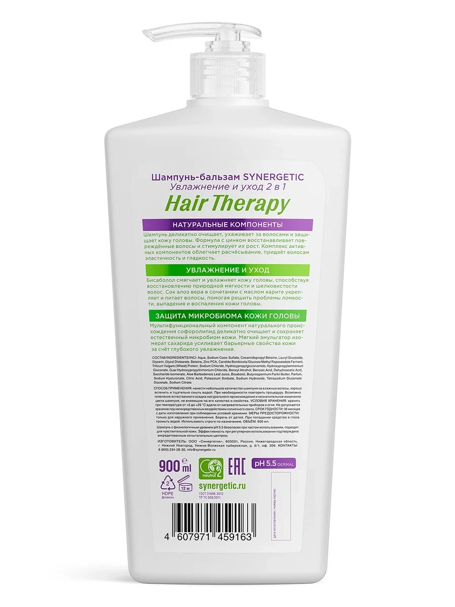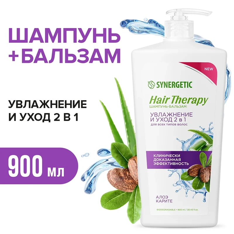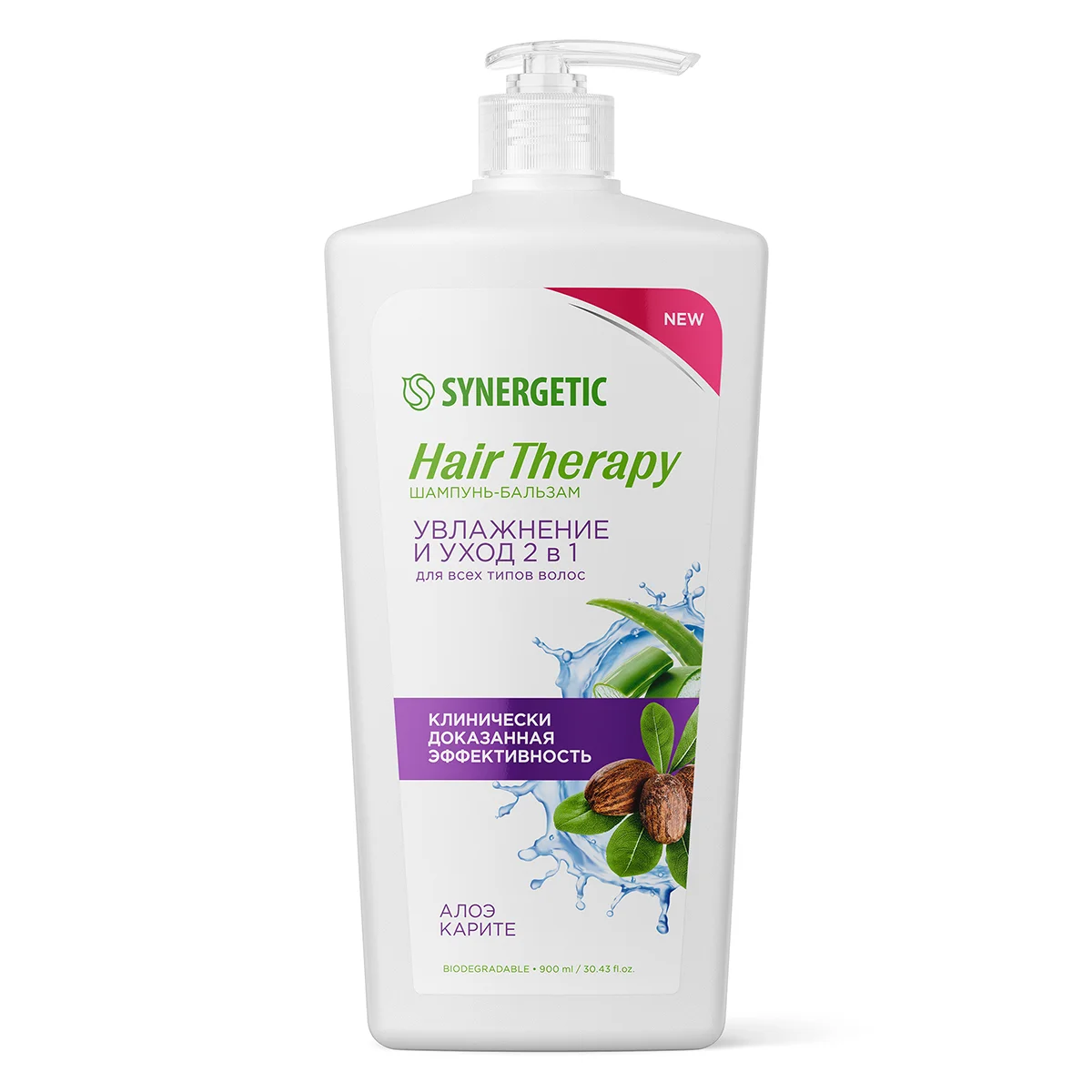 Шампунь-бальзам Synergetic Hair Therapy Увлажнение и уход 2 в 1 с алоэ и карите, 900мл