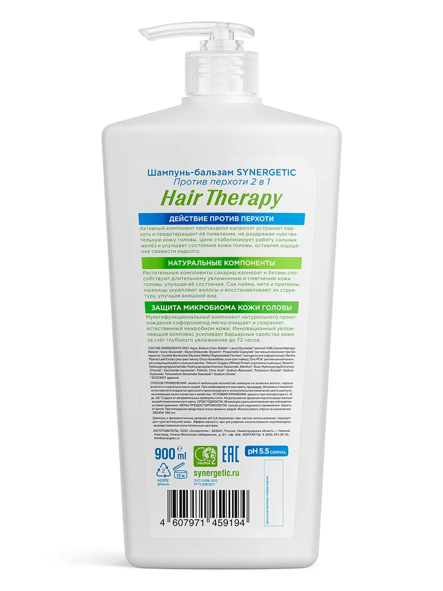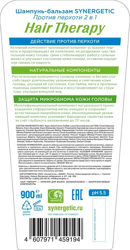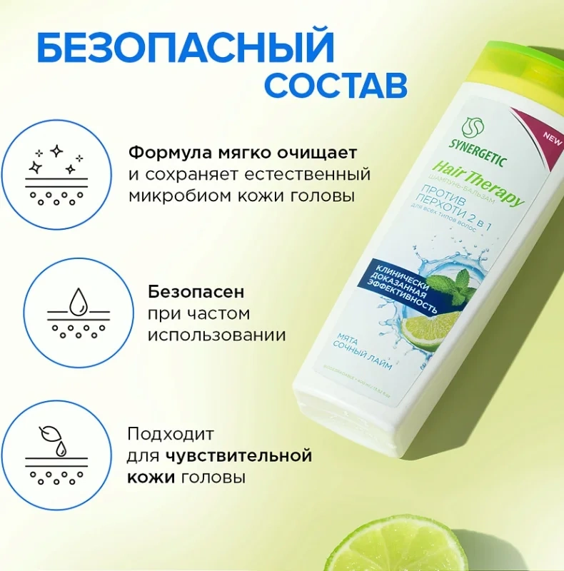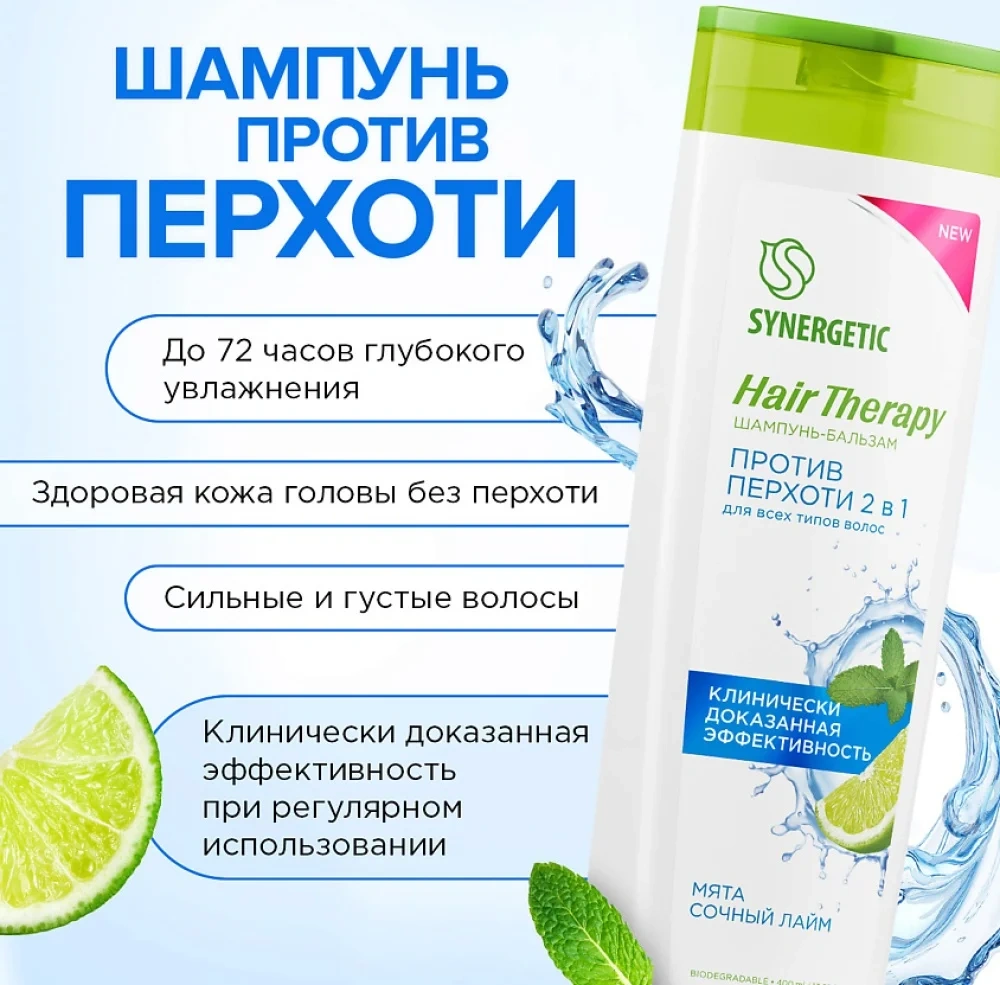 Шампунь-бальзам Synergetic Hair Therapy против перхоти 2 в 1 с мятой и лаймом, 900мл