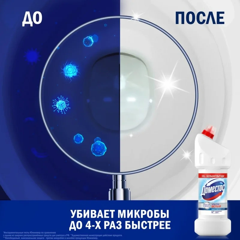Назначение: Чистящее средство для туалета и ванной Domestos Ультра Белый поможет обеспечить чистоту и гигиену унитаза, устранение неприятных запахов, удаление плесени и мыльного осадка, антимикробную обработку малых поверхностей и предотвращение появления известкового налета. Многофункциональный гель Domestos Ультра Белый может применяться для очищения ванны, стоков и сливов, мытья различных поверхностей (пол, кафель, детские игрушки) и даже для отбеливания белья. Доместос гель для унитаза оснащен удобным семиструйным дозатором, который помогает равномерно и экономно наносить средство на нужную поверхность. Чистящее средство для туалета и ванной Доместос Ультра Белый: уничтожает бактерии, плесень, грибки, вирусы и споры; помогает устранить неприятные запахи; помогает предотвращать появление известкового налета; отбеливает фаянсовые поверхности; обладает густой экономичной формулой и оснащен 7-струйным дозатором; может использоваться для отбеливания белья; используется в разбавленном или неразбавленном виде.