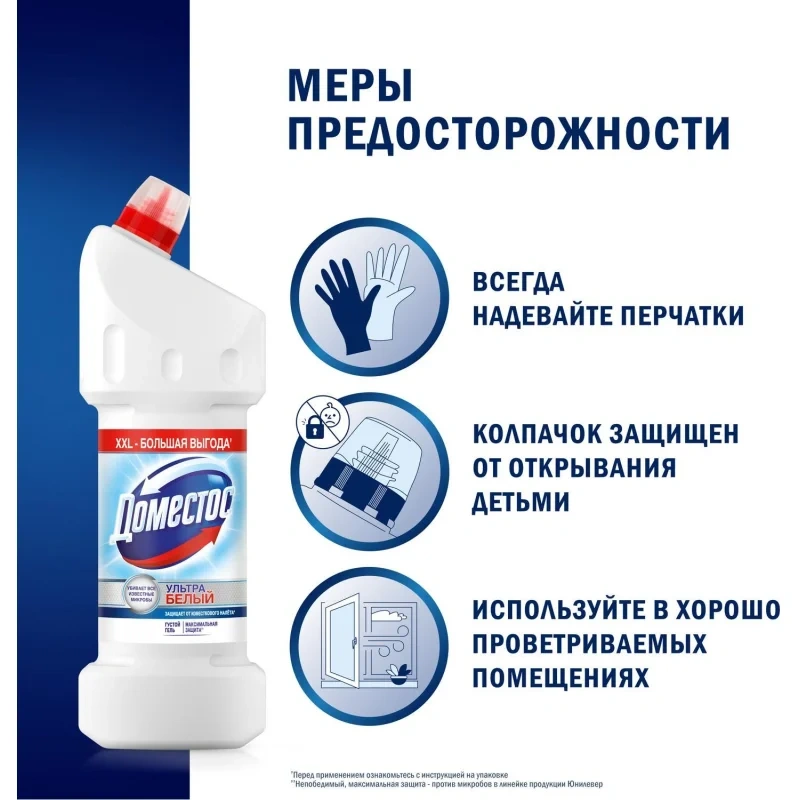 Способ применения: Колпачок защищен от открывания детьми. Чтобы открыть, надавите на уплотнения по бокам колпачка и поверните против часовой стрелки. Чтобы закрыть, поверните колпачок по часовой стрелке до щелчка. Применение неразбавленным: Унитаз нанесите Domestos под ободок унитаза (около 80 мл). Для максимального эффекта оставьте на ночь. Domestos отчистит грязь, устранит неприятные запахи и уничтожит микробы. Раковины и ванны: нанесите Domestos на поверхность и обработайте с помощью щетки. Через 5 минут тщательно смойте. Domestos отчистит грязь и уничтожит микробы, включая грибок Сливы и водостоки на кухне и в ванной: налейте Domestos в сливное отверстие, оставьте на 5 минут, затем промойте водой. Применение разбавленным: Полы и рабочие поверхности: 4 колпачка Domestos на 5 л воды. Не используйте неразбавленным для мытья полов. Кафель: 4 колпачка Domestos на 5 л воды. Смочите губку в растворе и обработайте кафель. Domestos очистит поверхность и уничтожит микробы, включая грибок. Губки для мытья посуды: промойте в специальном раствое с дезинфицирующим эффектом: 2 колпачка Domestos на 3 литра воды.