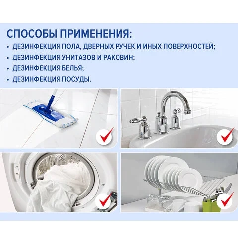Назначение: для обеззараживания поверхностей в помещениях, жесткой мебели, санитарно-технического оборудования, наружных поверхностей приборов и аппаратов, медицинских изделий, посуды, предметов ухода за больными, белья, уборочного инвентаря, выделений (кровь, мокрота, моча, смывные воды и т.д.), отходов медицинских, игрушек, резиновых и пропиленовых ковриков, обуви из резин, пластмасс и других полимерных материалов.