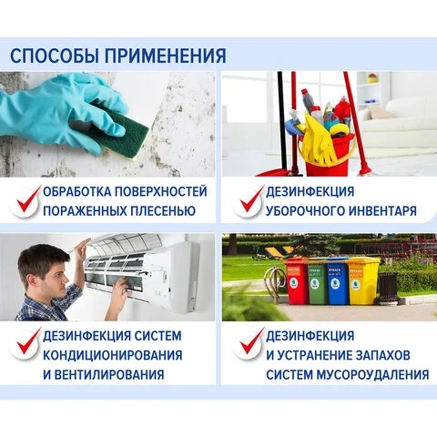 Область применения: медицинские организации, аптеки, диагностические лаборатории, пункты и станции переливания и забора крови, санитарный транспорт, инфекционные очаги; профилактическая дезинфекция систем мусороудаления, автотранспорт для перевозки пищевых продуктов, предприятия коммунально-бытового обслуживания, торговые, развлекательные центры, предприятия общественного питания и торговли, продовольственные и промышленные рынки, учреждения образования, культуры, отдыха, объекты курортологии, спорта, учреждения военные (включая казармы), общественные туалеты, пенитенциарные, учреждения социального обеспечения, заключительная дезинфекция в детских учреждениях; проведение генеральных уборок; предприятия молочной и мясной промышленности, предприятия пищевой и перерабатывающей промышленности; для обеззараживания воды в системы хозяйственно-питьевого водоснабжения, воды в плавательный бассейнов; для дезинфекции шахтных колодцев и обеззараживания воды в них, для дезинфекции поверхностей, пораженных плесенью, для дезинфекции скорлупы яиц.