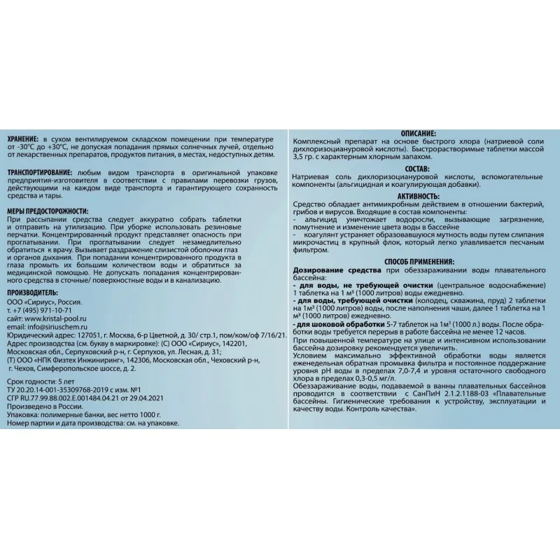 Состав: натриевая соль дихлоризоциануровой кислоты, вспомогательные компоненты (альгицидная и коагулирующая добавки). Активность: средство обладает антимикробным действием в отношении бактерий, грибов и вирусов. Входящие в состав компоненты: альгицид уничтожает водоросли, вызывающие загрязнение, помутнение и изменение цвета воды в бассейне, коагулянт устраняет образовавшуюся мутность воды путём слипания микрочастиц в крупный флок, который легко улавливается песчаным фильтром.