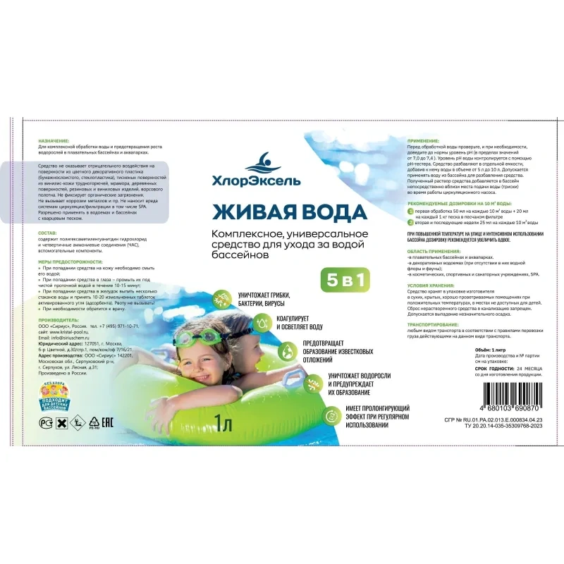 Средство для бассейна Хлорэксель Живая вода 1л, дезинфицирующее, без хлора