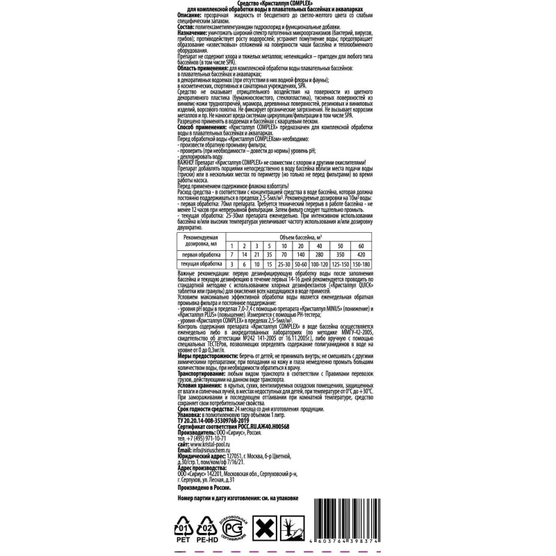 Средство для бассейна Кристалпул COMPLEX 1л, для комплексной обработки воды