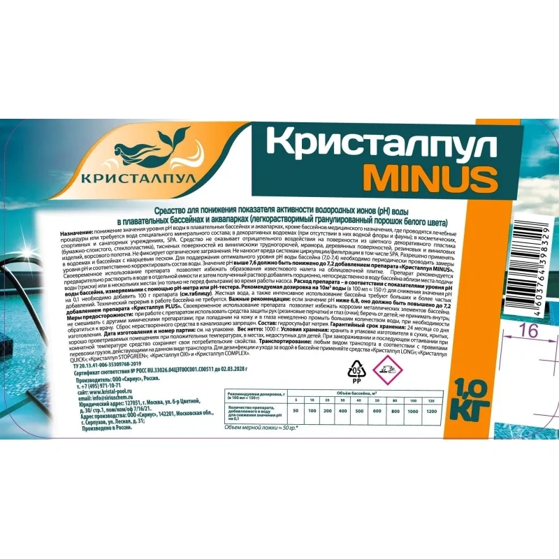 Средство для понижения уровня pH воды в бассейнах Кристалпул Minus 1 кг