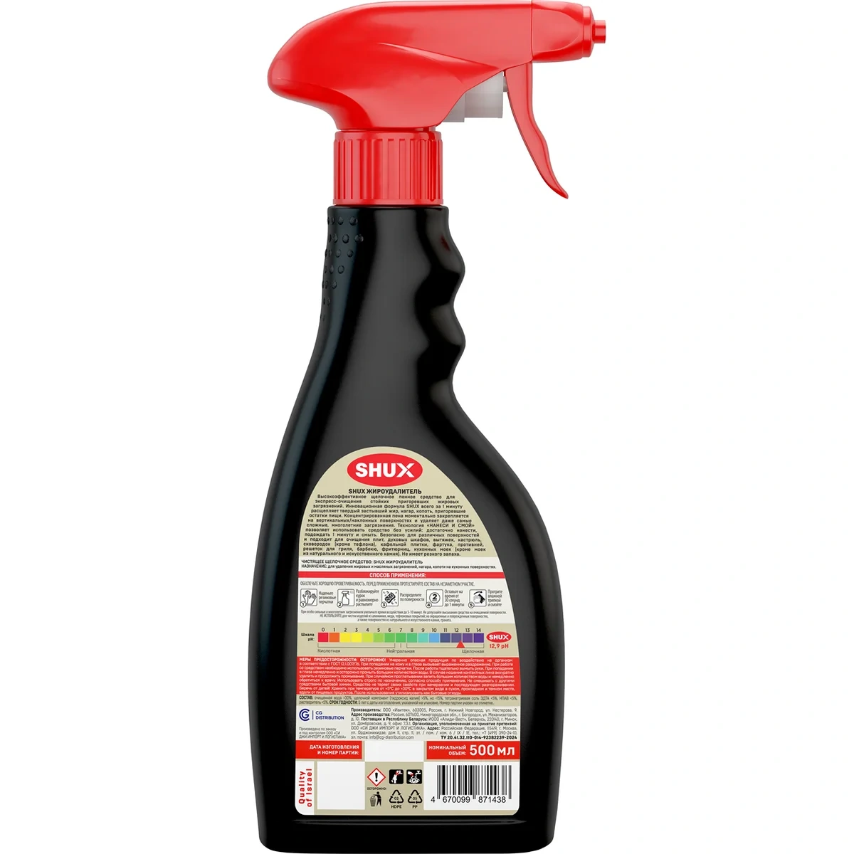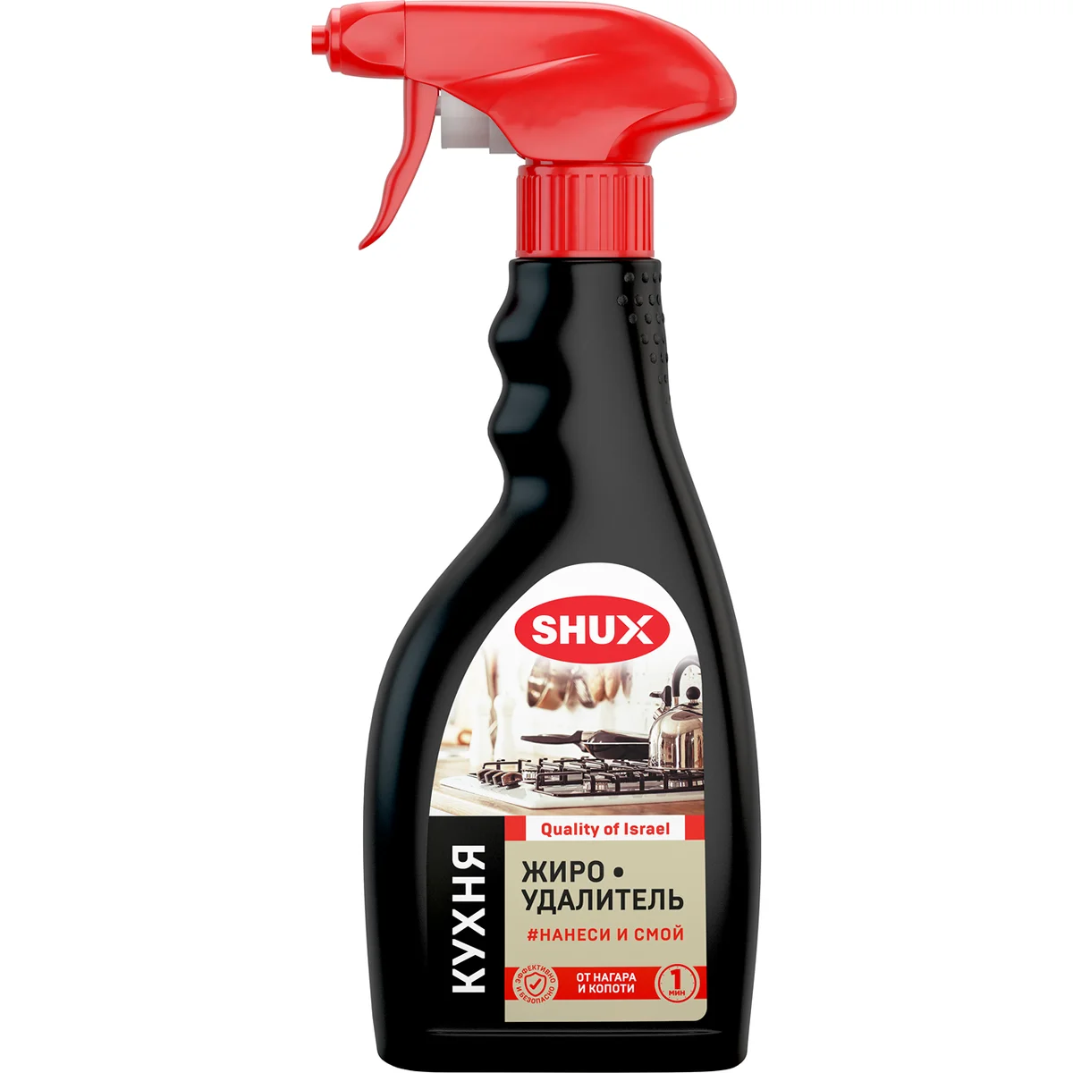 Высокоэффективное щелочное средство для экспресс-очищения стойких пригоревших жировых загрязнений. Инновационная формула SHUX всего за 1 минуту расщепляет твердый застывший жир, нагар, копоть, пригоревшие остатки пищи. Состав мгновенно проникает внутрь даже самых сложных многолетних загрязнений, полностью нейтрализует их. Технология 'НАНЕСИ И СМОЙ' позволяет использовать средство без усилий: достаточно нанести, подождать 1 минуту и смыть. Эффективно и безопасно для различных поверхностей и подходит для очищения плит, духовых шкафов, вытяжек, кастрюль, сковородок (кроме тефлона), кафельной плитки, фартука, противней, решеток для гриля, барбекю, фритюрниц, кухонных моек (кроме моек из натурального и искусственного камня).
