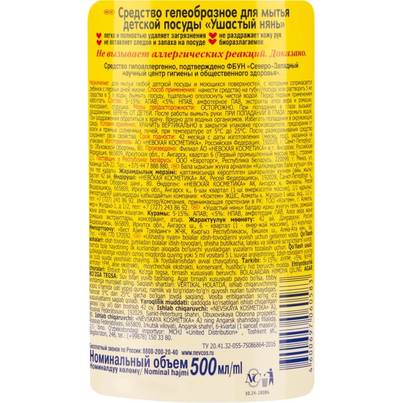 Назначение:средство предназначено для мытья посуды, в том числе детской, бутылочек из стекла и пластика, сосок из латекса и силикона, а также любых моющих поверхностей, с которыми соприкасается ребёнок с первых дней жизни. Легко и полностью удаляет загрязнения. Не оставляет следов и запаха на посуде. Не раздражает кожу рук.