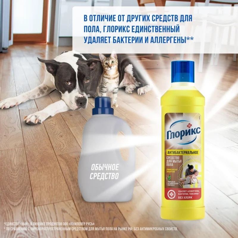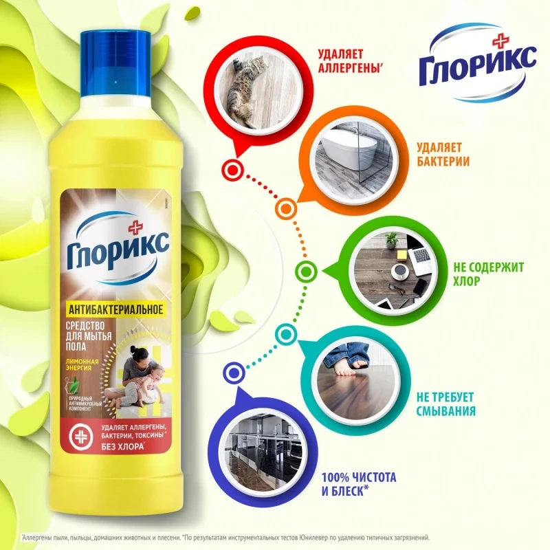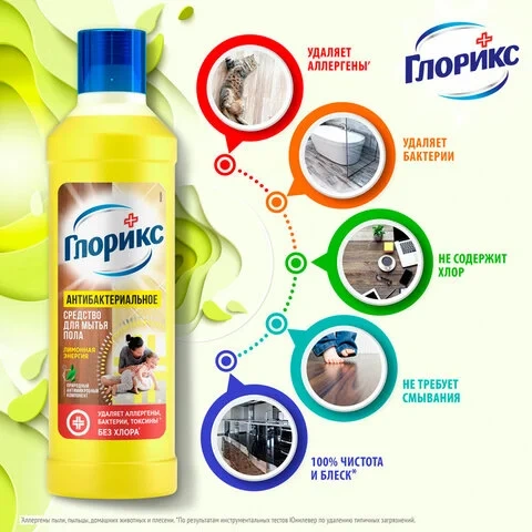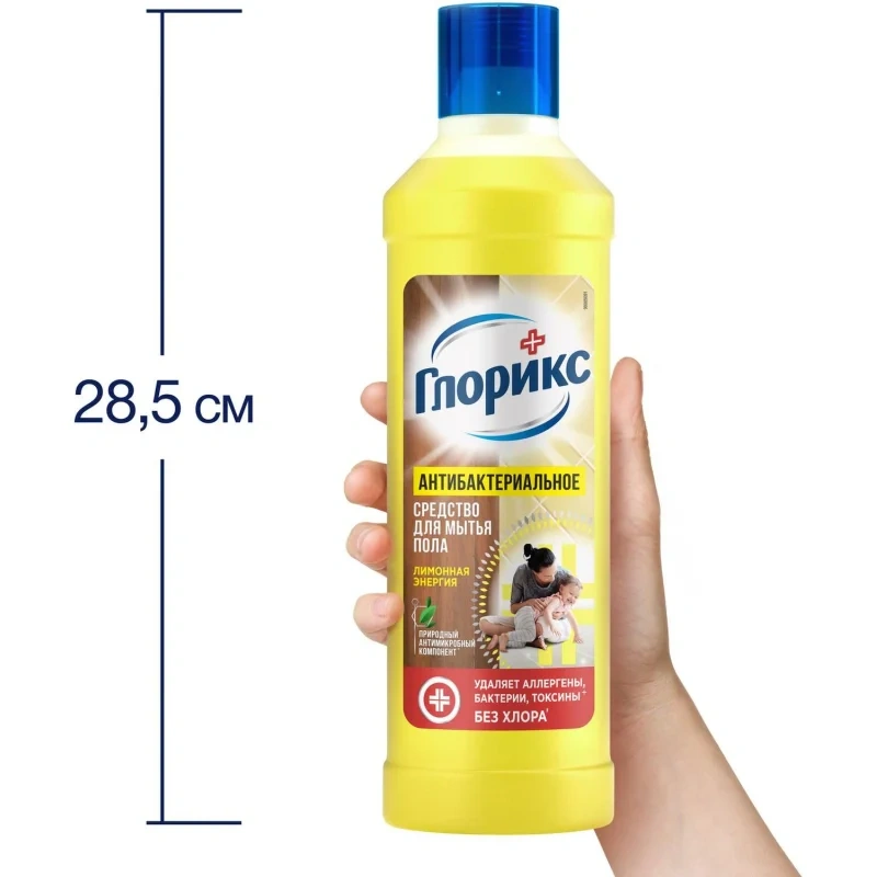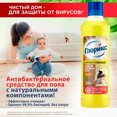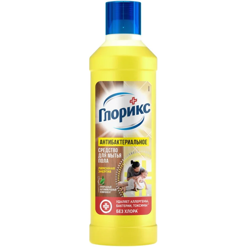 ГЛОРИКС средство для мытья пола 'Лимонная Энергия' эффективно очищает, обладает дезинфицирующим эффектом, устраняя 99.99% бактерий. ГЛОРИКС для мытья полов эффективно борется не только с бактериями и грязью, но и с аллергенами, что крайне актуально в весенне-летний период или если дома есть животные. Удаляет основные аллергены пыли, пыльцы, домашних животных, плесени. Благодаря натуральным эфирным маслам, оставляет свежий и приятный аромат надолго. Быстро высыхает, не оставляя разводов. Средства ГЛОРИКС идеально подходят для ежедневной гигиены во всем доме.
