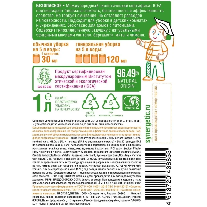 Биоразлагаемое средство для мытья поверхностей Synergetic – универсальное средство для ежедневной и генеральной уборки пола и других поверхностей: столов, стен, потолка. Не требует смывания, идеально подходит для паркета ламината, плитки, линолеума, камня, металла, стекла, пластика, дерева, обоев. Средство подходит для ручной уборки и чистки моющим пылесосом, а также для уборки в детских помещениях. Комплекс мягких биоразлагаемых тензидов, полученных из растительных масел, и зеленых хелатов обеспечивает высокое качество уборки поверхностей даже при использовании холодной и жесткой воды, эффективно удаляет загрязнения и неприятные запахи. Средство обладает антибактериальным действием за счет синергетической комбинации мягких растительных К-тензидов и натуральных эфирных масел. Гипоаллергенная отдушка на основе эфирных масел сантала, бергамота, мяты и лимона придает средству приятный свежий аромат, который подходит даже для людей с чувствительной кожей