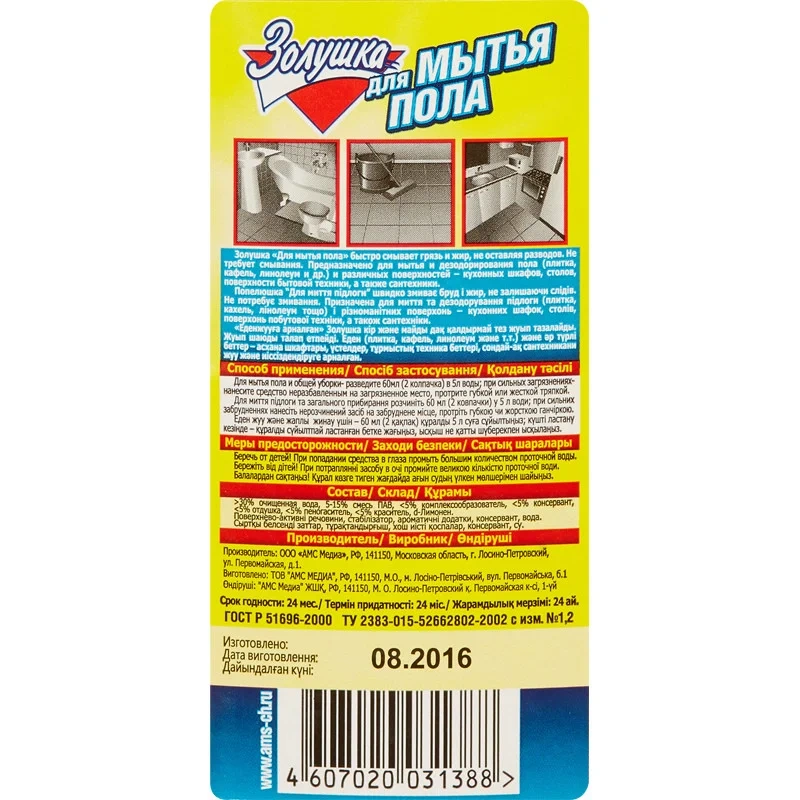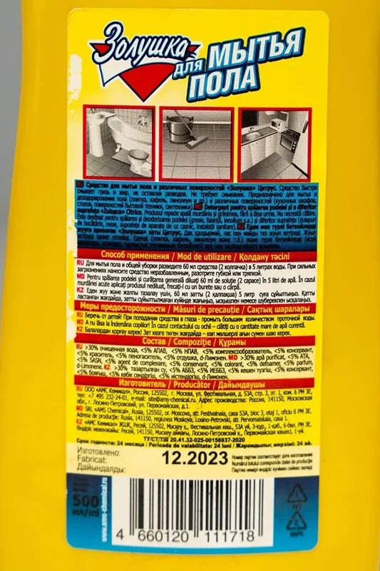 Способ применения: для ежедневной уборки растворить 60 мл средства (2 колпачка) в 5 литрах воды. Для очистки сильных загрязнений использовать в неразбавленном виде, оставить на 3 минуты и смыть.