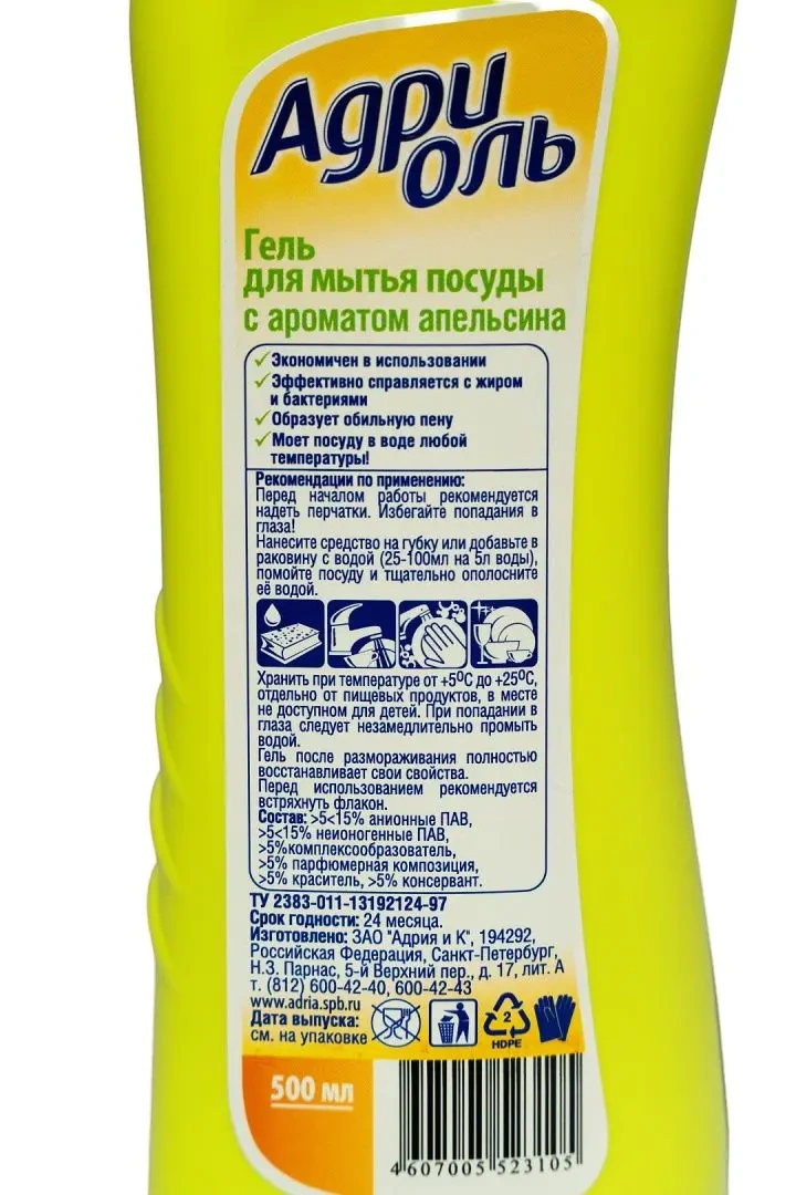 Моющие средство АДРИОЛЬ 500 мл гель для посуды апельсин.Гель для мытья посуды. Экономично в использовании. Образует обильную пену. Эффективно в воде любой температуры. Содержит антикоррозийные добавки. В значительной степени нейтрализует отрицательное воздействие солей жёсткости на моющий процесс и внешний вид вымытой посуды. С запахом лимона.Область применения. Оптимально для мытья посуды из стекла, фарфора, нержавеющей стали, серебра. Используется для мытья противней и кухонного инвентаря. Эффективно справляется с жиром и бактериями. Применимо в компаниях общественного питания, в быту, в дачных условиях.Метод применения. Встряхнуть флакон, если средство подвергалось замораживанию. Нанести гель на губку или добавить в раковину с водой, помыть посуду и тщательно её ополоснуть. Рекомендуемая степень разбавления 1:150 – для удаления загрязнений среднего уровня.Состав: 5-15% анионные ПАВ, 5-15% неионогенные ПАВ, <5% комплексообразователь, парфюмерная композиция, краситель, консервант.ТУ 2383-011-13192124-97Срок годности: 24 мес.