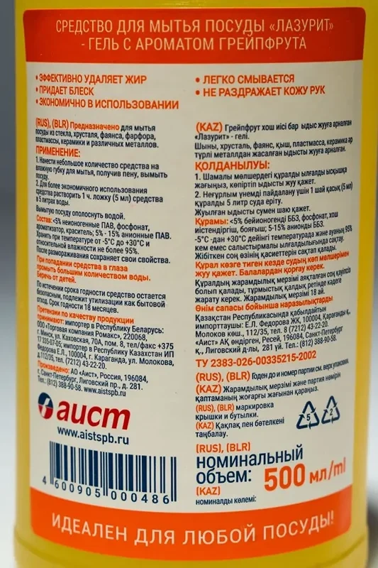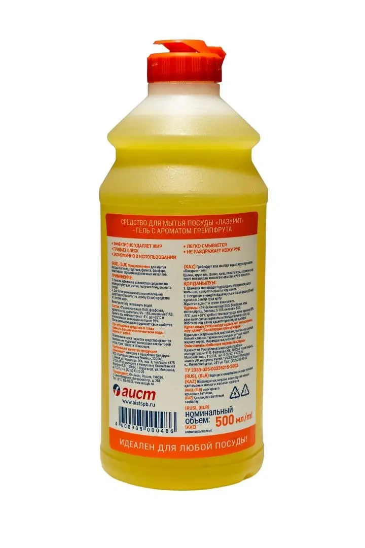 Средство для посуды ЛАЗУРИТ Аист 500мл с ароматом грейпфрута.Состав: менее 5% н-ПАВ, фосфонат, 5-15% а-ПАВ. Дополнительно: ароматизатор, краситель.Срок годности: 18 мес.ТУ 2383-026-00335215-2002