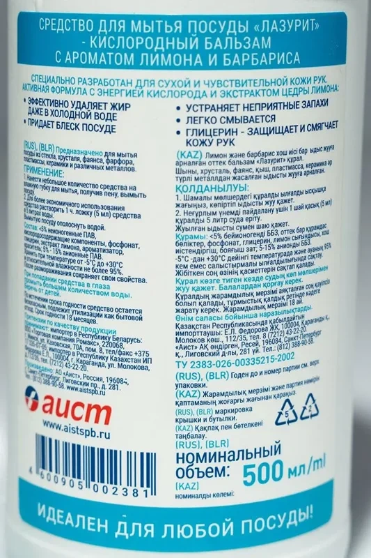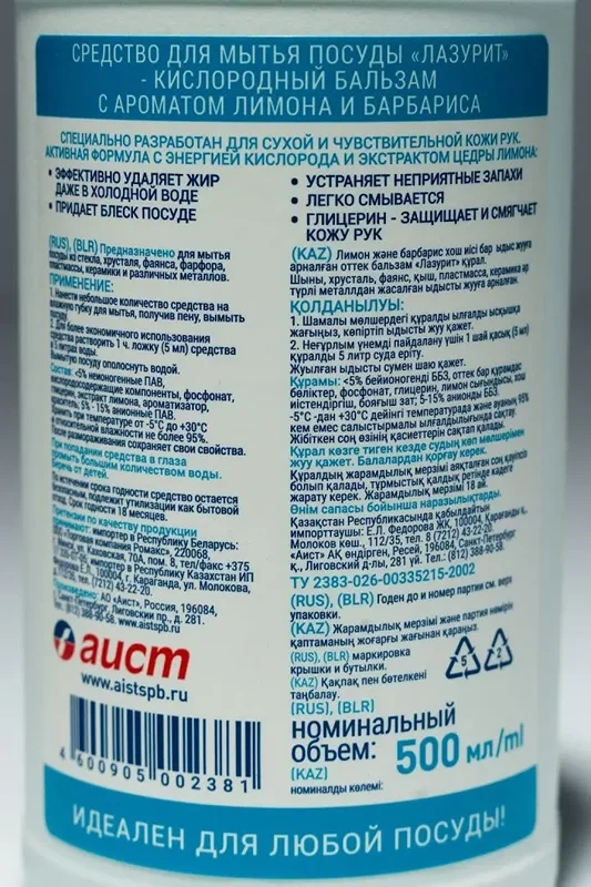 Средство для посуды ЛАЗУРИТ бальзам Аист 500мл.Состав: менее 5% н-ПАВ, кислородосодержащие компоненты, фосфонат, 5-15% а-ПАВ. Дополнительно: глицерин, экстракт лимона, консервант, ароматизатор, краситель.Срок годности: 18 мес.ТУ 2383-026-00335215-2002