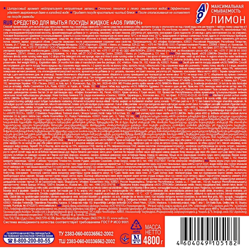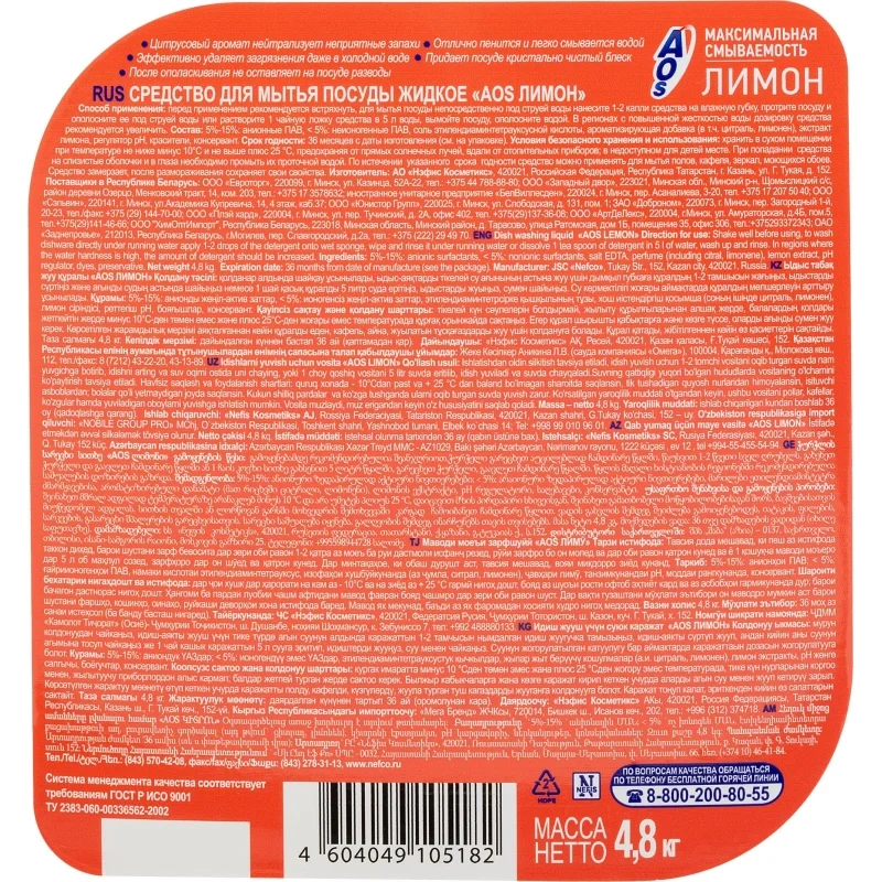 Средство для мытья посуды AOS Лимон гель 4.8 л