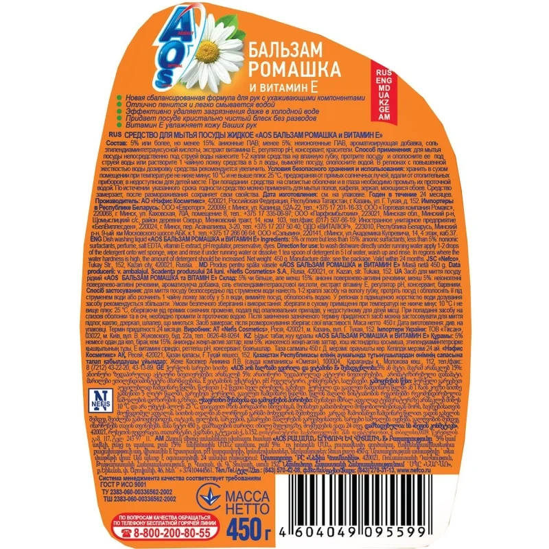 Средство для мытья посуды Aos 450мл, ромашка и витамин е, бальзам