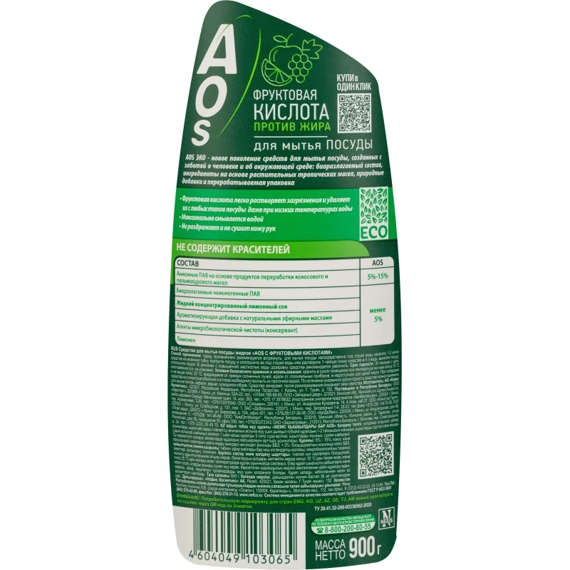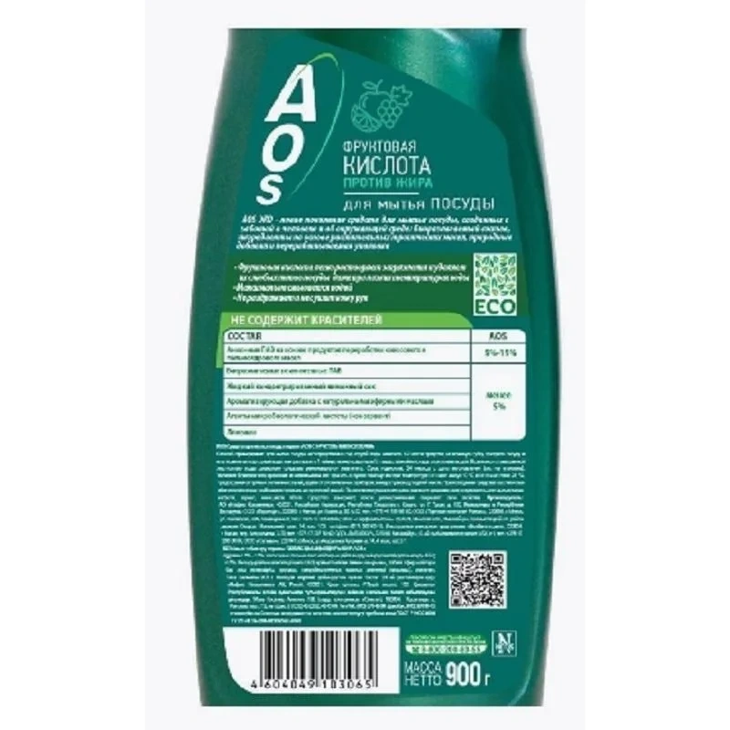 Средство для мытья посуды Aos Эко 900мл, с фруктовыми кислотами