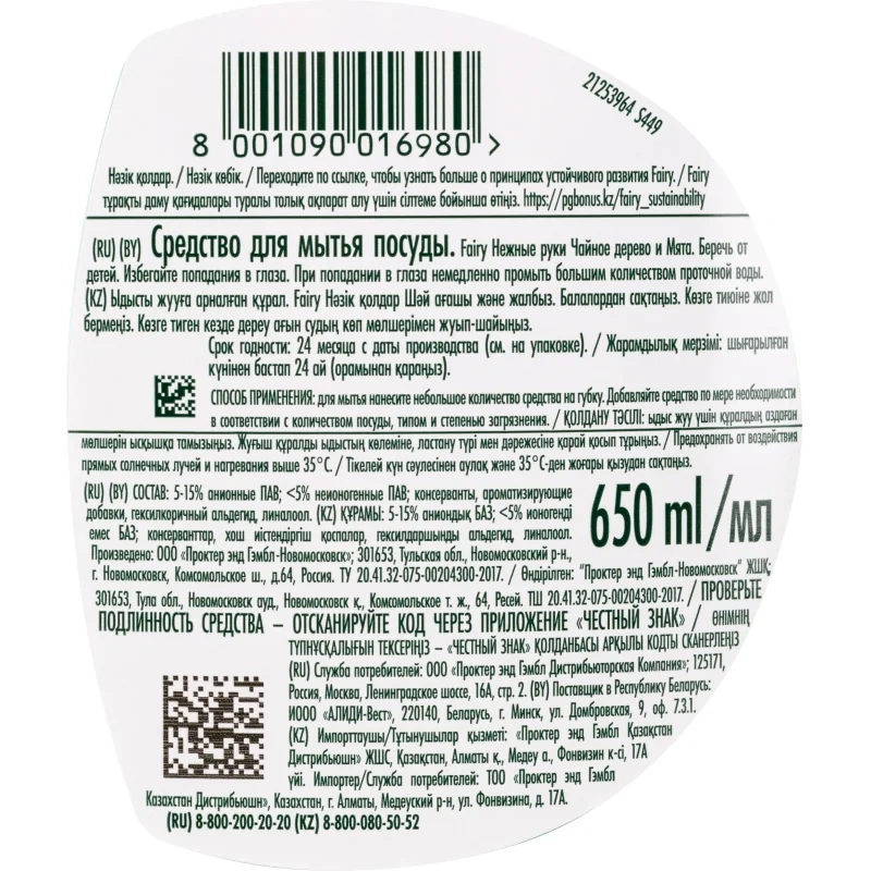 Средство для мытья посуды Fairy Нежные руки 650мл, чайное дерево-мята