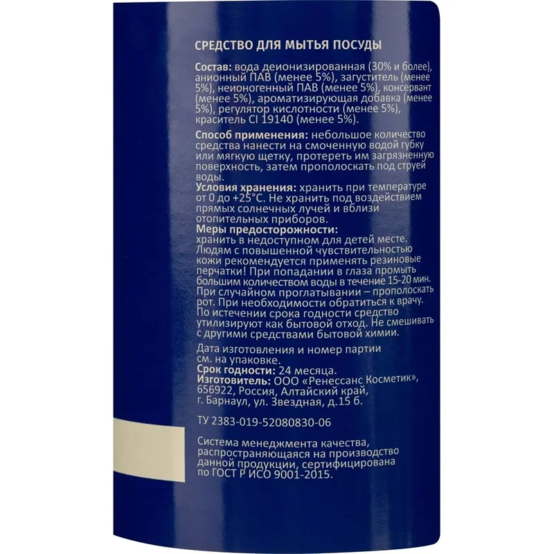 >= 30 % вода, >= 5 %, но < 15 % АПАВ, < 5 %: хлорид натрия, НПАВ, парфюмерная композиция, тетранатриевая соль этилендиаминтетрауксусной кислоты, лимонная кислота, консервант, краситель.