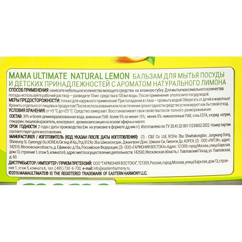 Назначение: Бальзам для мытья посуды, фруктов, овощей и детских принадлежностей.