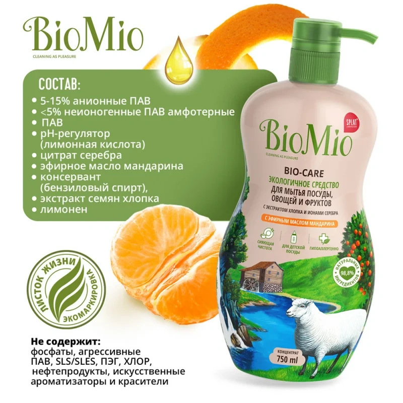 Экологичное средство для мытья посуды Bio-Care с эфирным маслом мандарина - это эффективное средство с мягким безопасным действием, которое идеально подходит для мытья детской посуды, овощей и фруктов. Специальная формула с экстрактом хлопка оказывает мягкое действие на кожу рук, ионы серебра обеспечивают антибактериальную защиту, а аромат мандарина успокаивает и снимает усталость. Концентрированная формула обеспечивает экономичный расход. Отлично подходит для использования в домах с автономной канализацией. Безопасно для планеты. Имеет экологический сертификат Листок жизни.