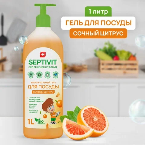 Средство для мытья посуды Septivit Сочный цитрус, 1л, биоразлагаемое, с дозатором