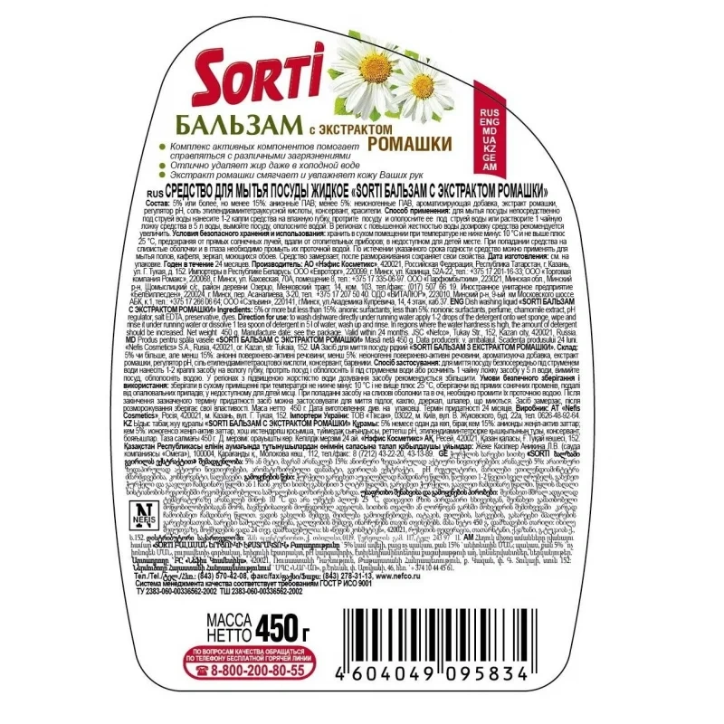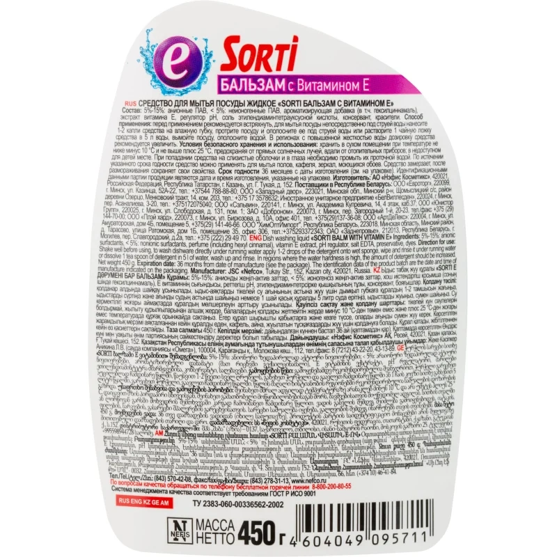 Средство для мытья посуды SORTI бальзам с витамином Е 450г