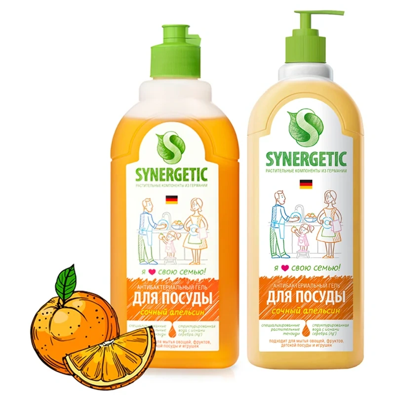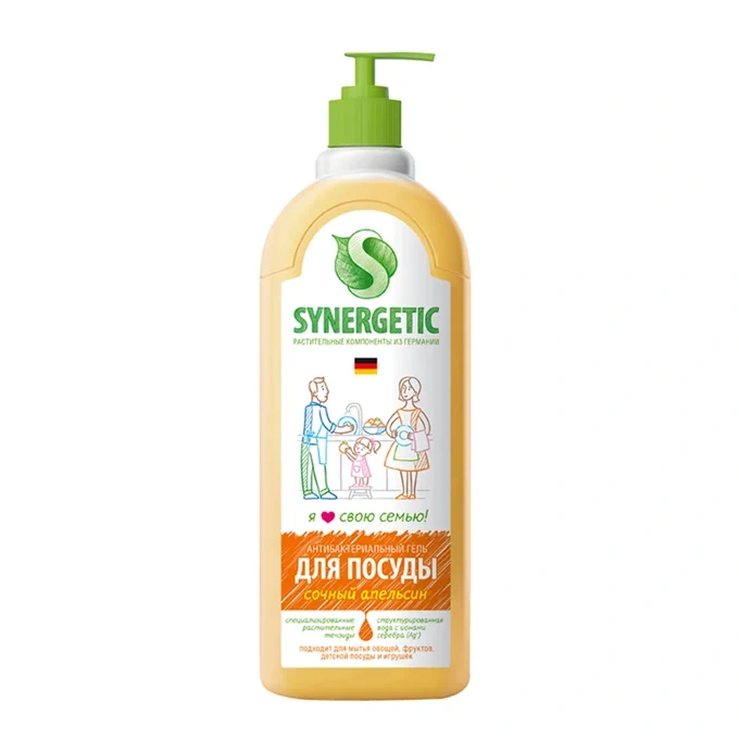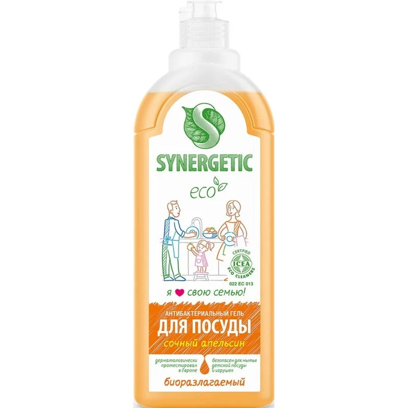 Средство для мытья посуды Synergetic Сочный апельсин гель 1л Назначение: концентрированный антибактериальный гель для посуды Synergetic- это экологичное, безопасное иэффективное средство для мытья посуды, фруктов иовощей. Гель полностью смывается водой иподходит для мытья детской посуды, бутылочек иигрушек. Устраняет жир изапахи спосуды даже вхолодной воде. Мягкие биоразлагаемые тензиды, полученные израстительного масла, удаляют органические загрязнения спосуды иобеспечивают хорошее пенообразование, невызывая раздражения кожи рук. Средство содержит гипоаллергенные отдушки наоснове эфирных масел ибезопасные пищевые красители, поэтому подходит для людей счувствительной кожей рук. Натуральный растительный глицерин всоставе геля защищает кожу рук отсухости ираздражения. Гель для посуды Synergetic сертифицирован вИтальянском институте этической иэкологической сертификации ICEA иимеет международный сертификат, подтверждающий биоразлагаемость, безопасность иэффективность средства науровне лидеров европейского рынка бытовой химии. Способ применения: нанести средство наочищаемую поверхность, вымыть поверхность, ополоснуть водой. При приготовлении моющего раствора используйте 5мл средства на1л воды. Меры предосторожности беречь отдетей, при попадании средства вглаза промыть водой. Использовать строго поназначению. Состав: Water, Sodium Laureth Sulfate, Sodium Lauryl Sarcosinate, Disodium Cocoamphodiacetate, Glycereth-7Cocoate, Lauryl Glucoside, Glycereth-2Cocoate, Glycerin, Sodium Chloride, Magnesium Sulfate, Citric Acid, Nonallergic Parfume with Natural Oils. Условия хранения: хранить при температуре невыше 45C; под воздействием солнечных лучей возможно изменение цвета. Средство замерзает, после размораживания иперемешивания сохраняет свои свойства. Срок годности: 2года сдаты изготовления (дату изготовлениясм.наупаковке).