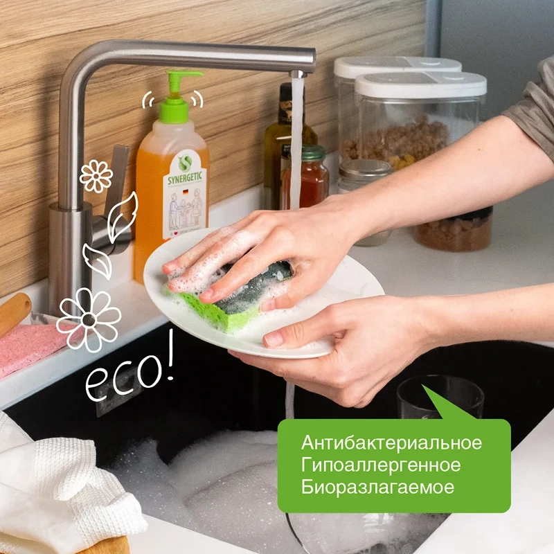 Концентрированный антибактериальный гель для посуды Synergetic – это экологичное, безопасное и эффективное средство для мытья посуды, фруктов и овощей. Гель полностью смывается водой и подходит для мытья детской посуды, бутылочек и игрушек. Устраняет жир и запахи с посуды даже в холодной воде. Мягкие биоразлагаемые тензиды, полученные из растительного масла, удаляют органические загрязнения с посуды и обеспечивают хорошее пенообразование, не вызывая раздражения кожи рук. Средство содержит гипоаллергенные отдушки на основе эфирных масел и безопасные пищевые красители, поэтому подходит для людей с чувствительной кожей рук. Натуральный растительный глицерин в составе геля защищает кожу рук от сухости и раздражения. Гель для посуды Synergetic сертифицирован в Итальянском институте этической и экологической сертификации ICEA и имеет международный сертификат, подтверждающий биоразлагаемость, безопасность и эффективность средства на уровне лидеров европейского рынка бытовой химии.