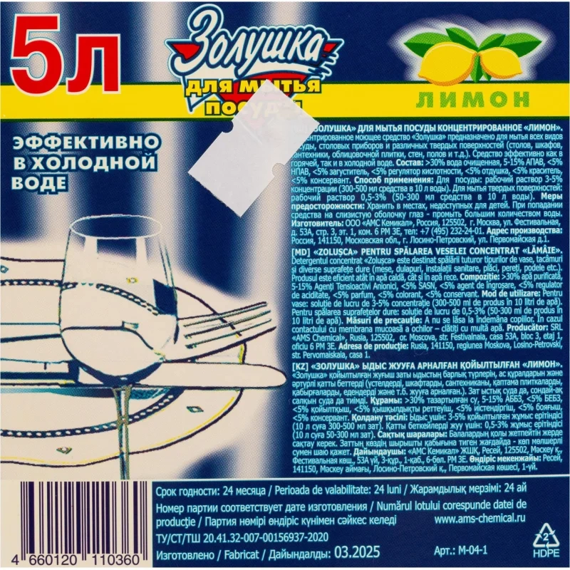 Средство для мытья посуды Золушка 5л, лимон, канистра