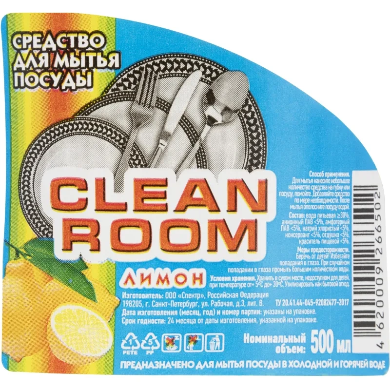 Средство для мытья посуды Clean Room Лимон жидкость 0.5 л с дозатором