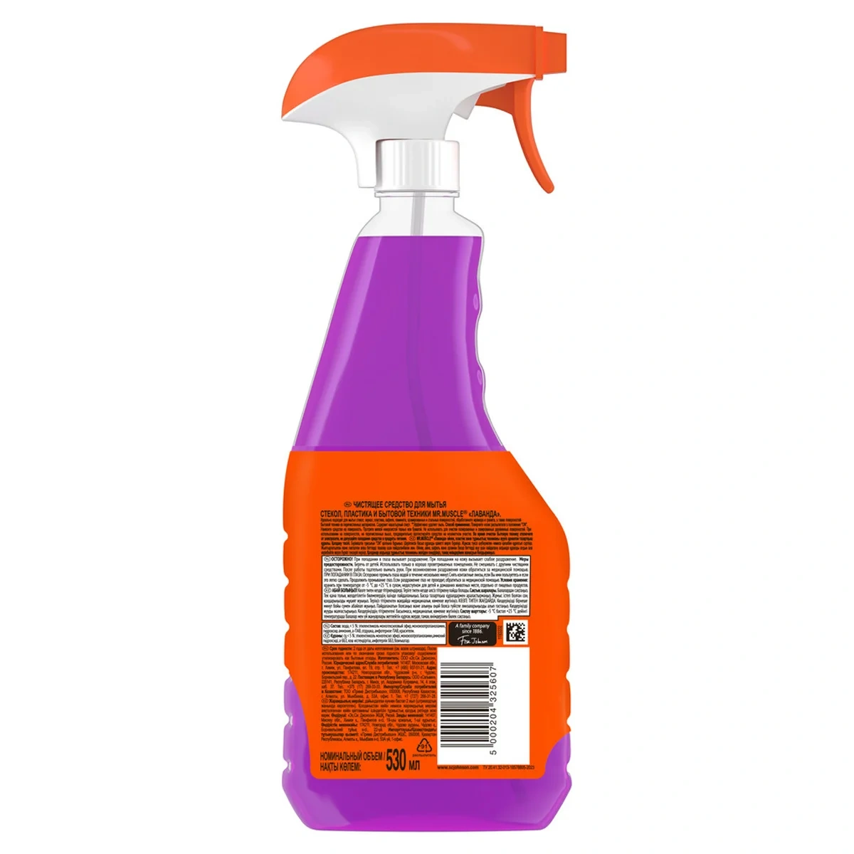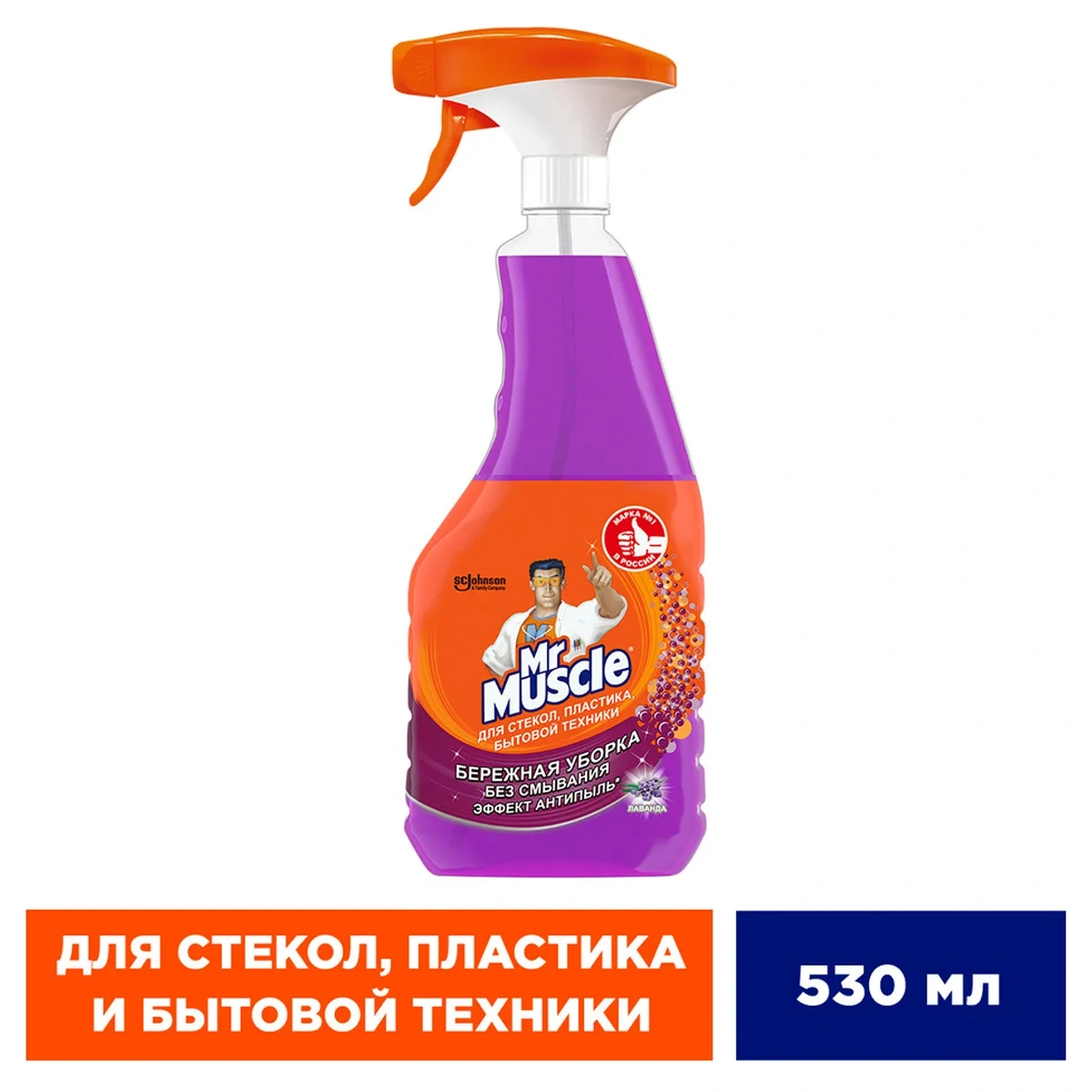 Назначение. Мистер Мускул средство для стёкол и поверхностей не только очистит стекла и зеркала до блеска, но и легко справится с очищением других поверхностей — кафеля, ламината, пластика, стальных и хромированных поверхностей, обработанного мрамора и гранита. Средство содержит нашатырный спирт, который эффективно удаляет грязь, жир, сажу, минеральные масла с поверхностей. Улучшенная форма носика распылителя позволяет одним движением наносить средство на большую поверхность. Чистота и блеск без разводов. С приятным ароматом лаванды.