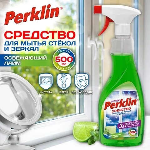 Средство для мытья стекол, зеркал, кафеля спрей/пена 500 мл, PERKLIN (ПЕРКЛИН) SUPER «Освежающий лай