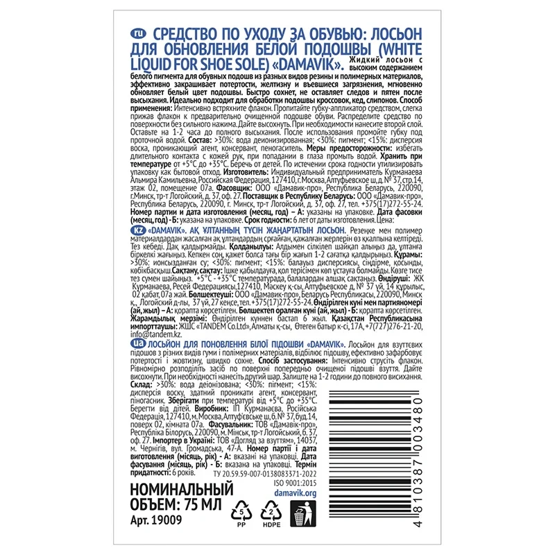 Жидкий лосьон с высоким содержанием белого пигмента для обувных подошв из разных видов резины и других полимерных материалов, предназначен для отбеливания подошв, эффективно закрашивает потертости, желтизну и въевшиеся загрязнения, мгновенно обновляет белый цвет подошвы. Быстро сохнет, не оставляет следов и пятен после высыхания. Идеально подходит для обработки подошвы кроссовок, кед, слипонов.