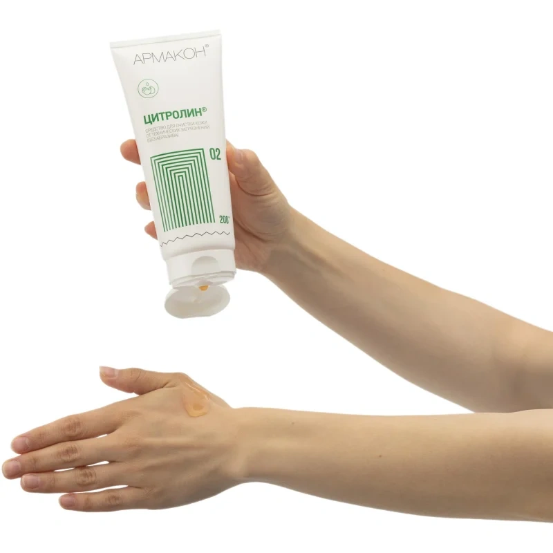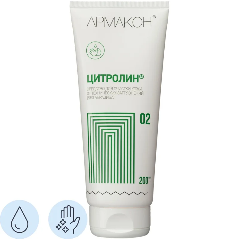 Очищающий гель Армакон Цитролин представляет собой средство для очистки кожи от технических загрязнений, не содержит абразива и позволяет легко удалить загрязнения технического характера (нефтепродуктов, масел, копоти, жира, угольной, графитовой, металлической пыли) с кожи рук. Благодаря комбинации мягких и безопасных ПАВ, средство наносится эффективно очищает кожу, не травмируя ее. Содержит инактиваторы, нейтрализующие вредное воздействие солей тяжелых металлов и химических раздражителей. Эффективность подтверждена научными исследованиями. Эффективно в воде любой жесткости; возможно применение без воды. Применим повсеместно при работах в условиях сильного загрязнения трудноудаляемыми материалами для обеспечения эффективной, бережной очистки кожи. Широко используется в машиностроении, железнодорожном транспорте, добыче полезных ископаемых (угля, нефти, газа, руды и т.д.), автотранспортных предприятиях, химическом производстве и так далее. С помощью средства Цитролин возможна эффективная очистка кожи без использования воды, достаточно удалить грязь салфеткой или ветошью. Средство подходит для частого использования. Обладает приятным ароматом. В состав включены увлажняющие и ухаживающие компоненты (олеиновая кислота, пропилен гликоль, ланолин). Не содержит растворителей, щелочей, абразивов, красителей, парабенов. Не добавляя воды нанести на руки небольшое количество (1-2 мл.) средства Цитролин. Хорошо втереть в течение 20 секунд, уделяя Особое внимание местам, где грязь въелась в кожу. Добавить небольшое количество воды (4-5 мл) и снова растереть в течение 20 секунд. Смыть водой или удалить загрязнения ветошью. Соответствует стандартам ТР ТС 019/2011, ГОСТ 31696-2012. Упаковка: туба 200 мл. Условия хранения: избегать попадания прямых солнечных лучей. Срок годности от даты изготовления 24 месяца.