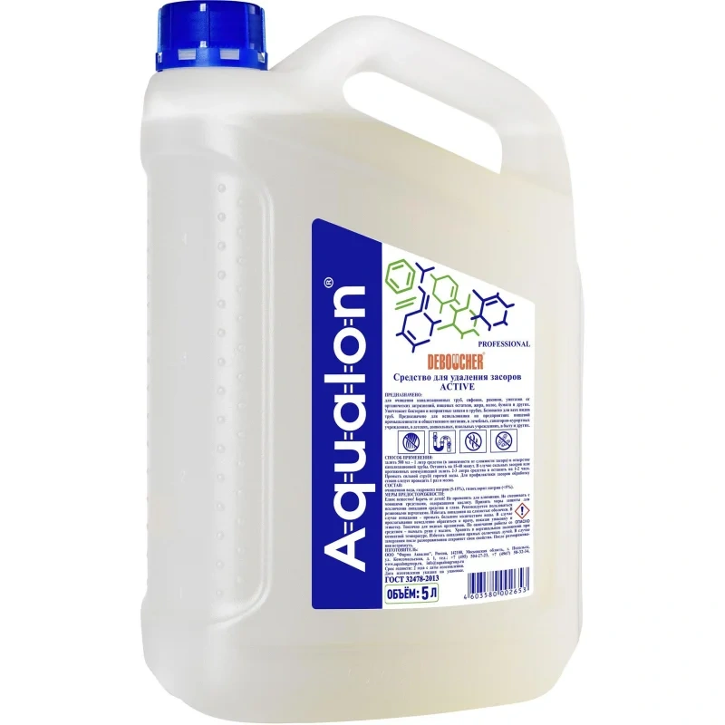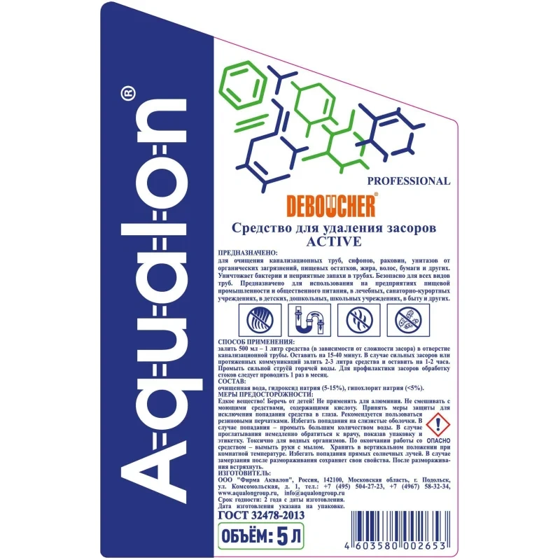 Средство для прочистки труб Дебошир Active жидкость 5 л. Назначение.Высокоэффективное средство 'Дебошир Актив' для прочистки засоров в канализационных трубах, сифонах, в раковинах и унитазах от органических загрязнений, пищевых остатков, жира, волос, бумаги и других. Уничтожает запахи и бактерии. Не повреждает эмаль и пластик. Способ применения.Залить 1 л средства и оставить на 15-40 минут. В случае сильных засоров или протяженных коммуникаций залить 2-3 л средства и оставить на 1-2 часа. Промыть сильной струей воды. Меры предосторожности. Беречь от детей! При работе со средством рекомендуется пользоваться резиновыми перчатками. При попадании в глаза промыть большим количеством воды. При случайном употреблении внутрь обратиться к врачу, показав флакон и этикетку. Состав.Очищенная вода, гидроксид натрия (5-15%), гипохлорит натрия (<5%). Условия хранения.Хранить в вертикальном положении при комнатной температуре вдали от обогревательных приборов. Избегать попадания прямых солнечных лучей. В случае замерзания, после размораживания сохраняет свои свойства. После размораживания встряхнуть. Срок годности. 2 года с даты изготовления.