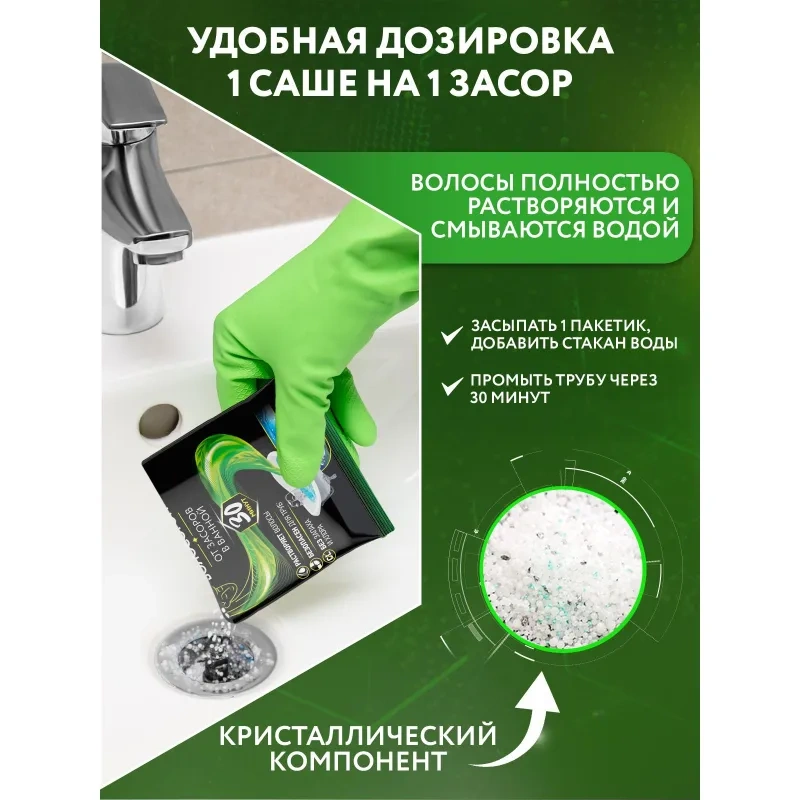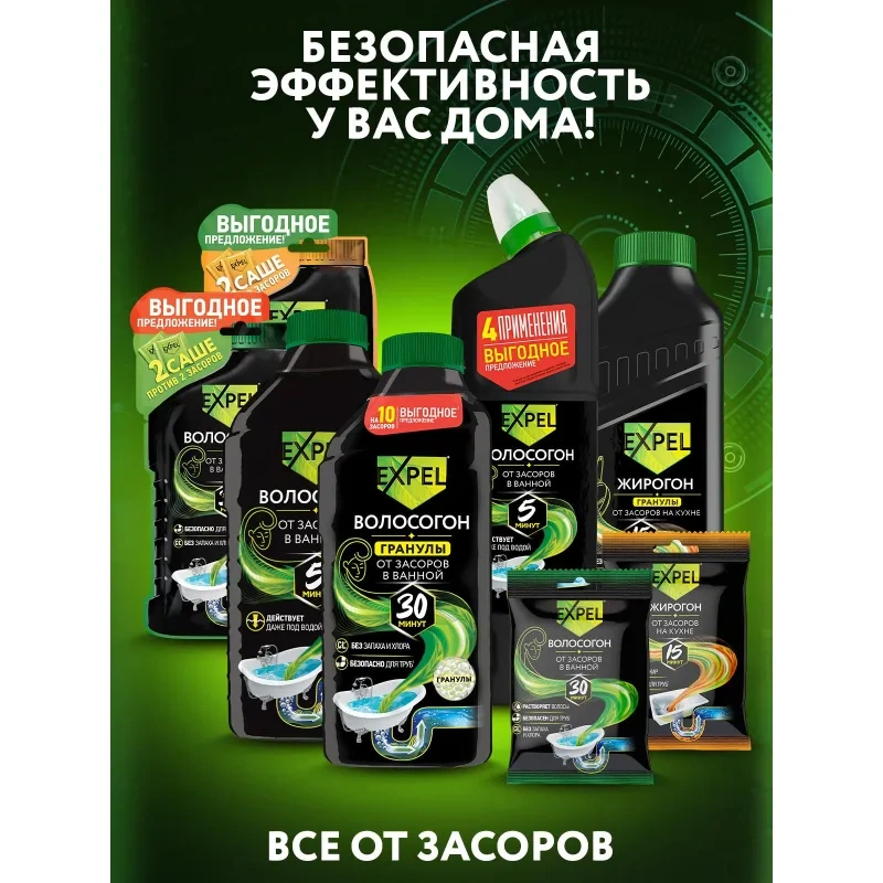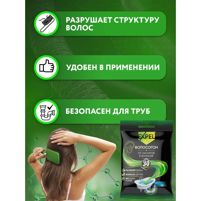 Назначение: Устали бороться с засорами в ванной. Доверьтесь эксперту, который в два счета справится с этой задачей ! Основная причина засоров в ванной — волосы. Специальное средство от засоров труб Expel ВОЛОСОГОН содержит особый кристаллический компонент, полностью разрушающий структуру волос. Вам нужно лишь высыпать содержимое саше в сливное отверстие и залить его стаканом воды, чтобы активировать действующее вещество и запустить химическую реакцию. Остальное EXPEL ВОЛОСОГОН сделает за вас всего за 30 минут. С EXPEL засоры просто улетучиваются! Устраняет засоры любой сложности, даже из спутанных волос, за 30 минут! Прост и удобен в использовании; Безопасен для труб; Не содержит хлора.